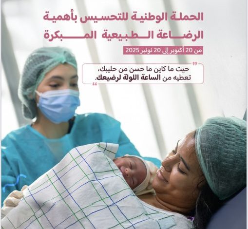 في إطار الالتزام المتواصل لتعزيز صحة وتغذية الأم والطفل، تطلق وزارة الصحة والحماية الاجتماعية، بشراكة مع المبادرة الوطنية للتنمية البشرية، من 20 أكتوبر إلى 20 نونبر 2025 النسخة الخامسة عشرة من الحملة الوطنية للتحسيس بأهمية الرضاعة الطبيعية، تحت شعار: “الرضاعة الطبيعية المثلى: ركيزة استراتيجية لتعزيز صحة الطفل خلال الألف يوم الأولى من حياته”.
