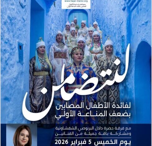 وستنظم هذه الأمسية يوم 5 فبراير المقبل بالمركب الثقافي أنفا بمدينة الدار البيضاء حيث تحييها فرقة الحضرة الشفشاونية بقيادة دلال البرنوصي كما ستتخلل السهرة فقرات إبداعية من فن عيساوة إلى جانب مفاجآت فنية أخرى تهدف إلى إضفاء طابع احتفالي روحاني يخدم في الوقت ذاته قضية إنسانية نبيلة